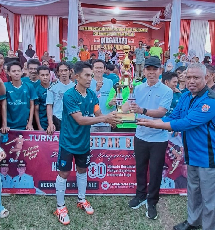 BERITA12PAS.COM – kecamatan Rilau Ale – Lapangan Desa Bontomanai menjadi saksi meriahnya partai final Turnamen Sepak Bola dalam rangka HUT RI ke-80 di Kecamatan Rilau Ale. Turnamen yang diikuti 14 tim dari 13 desa dan 1 kelurahan ini akhirnya melahirkan juara baru, yakni tim Bt. Bangun.