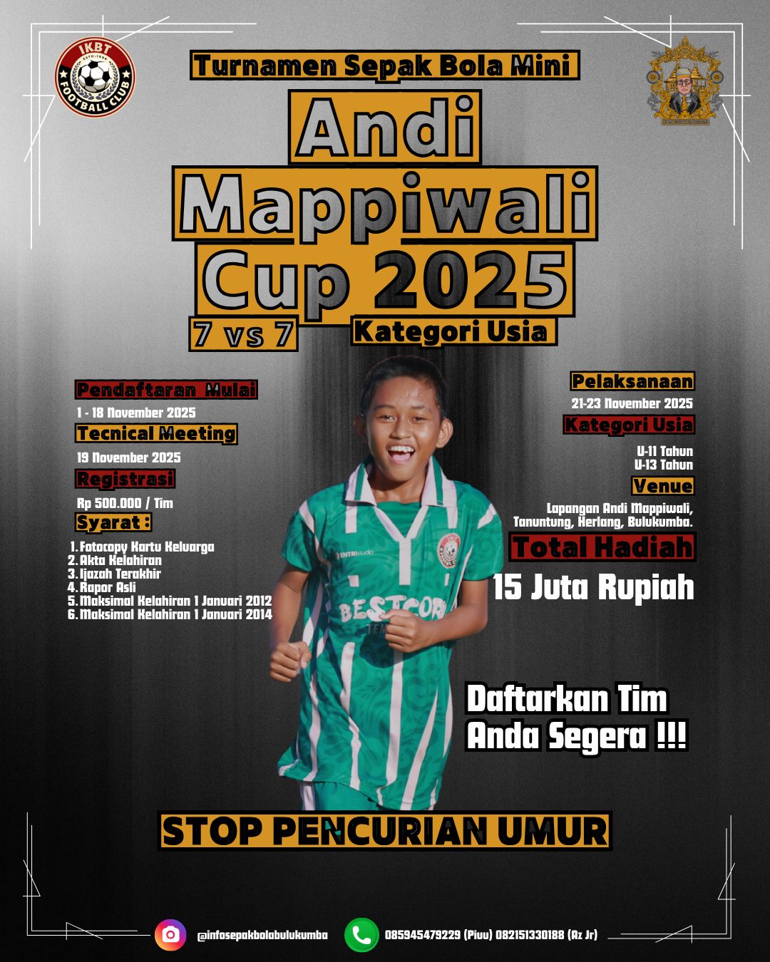 Turnamen bergengsi yang diinisiasi oleh IKBT Football Club ini akan mempertandingkan format 7 vs 7 dengan dua kategori usia, yakni U-11 tahun dan U-13 tahun. Kegiatan ini menjadi ajang penting dalam pembinaan bibit muda sepak bola di Bulukumba, sekaligus mempertegas semangat fair play dengan kampanye kuat bertajuk “Stop Pencurian Umur!”